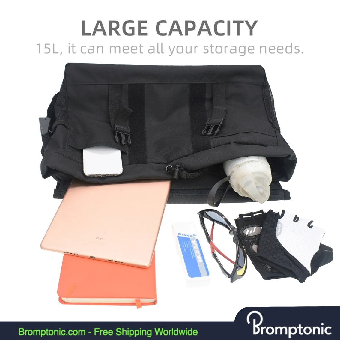 Spaziosa e organizzata - Capacità di 15L con spazio per un laptop da 14", attrezzi, bottiglia, portafoglio, guanti o abbigliamento.