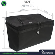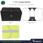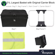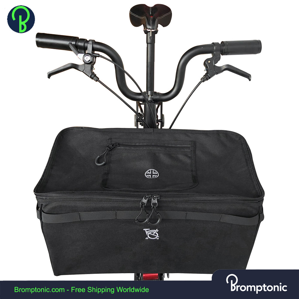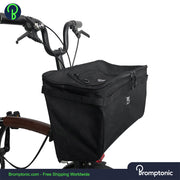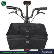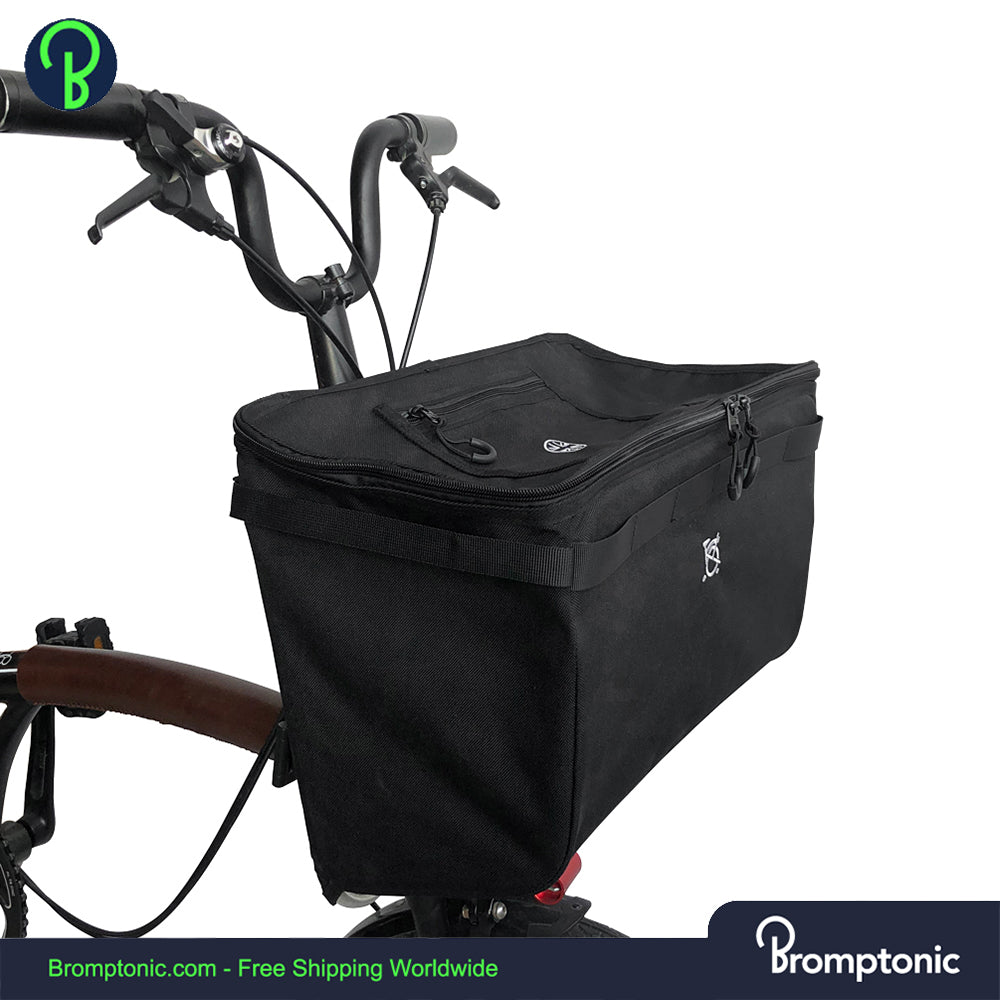 Realizzato in nylon 900D, questo cestino per borse anteriori Brompton è resistente all'acqua e garantisce la protezione dei vostri effetti personali dalle intemperie. È dotato di una copertura e di una chiusura a cerniera per una maggiore privacy e sicurezza, e la sua capacità di circa 21L consente di trasportare tutti gli oggetti essenziali.